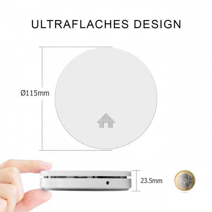 Der flache Melder fügt sich dadurch nahtlos und unauffällig in jede moderne Einrichtung ein. Die Melder-Unterseite ist gleichzeitig die Prüftaste mit Stummschaltfunktion. Eine Betriebs-LED zeigt die Funktionsbereitschaft des Melders an, diese sitz versteckt und unauffällig unter dem Gehäuse.